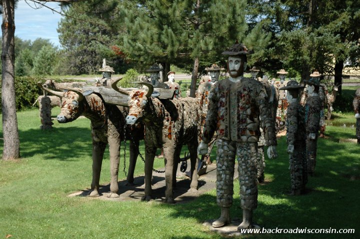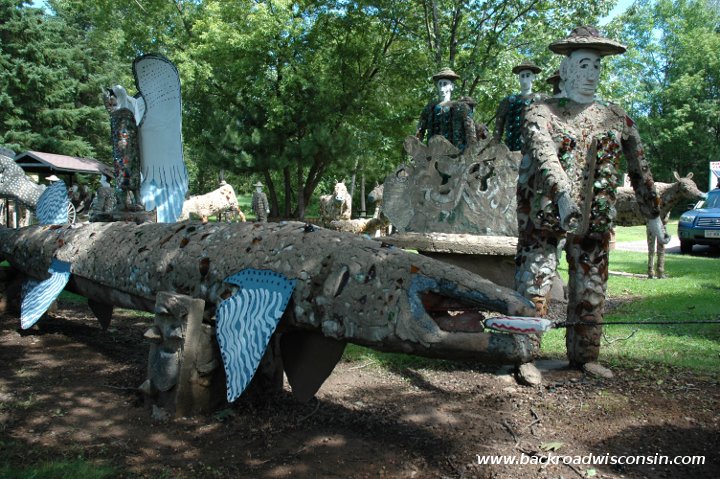 Located on the southern edge of Phillips, Wisconsin in Price Country lies one of the most unusual county parks you may ever encounter. The Wisconsin Concrete Park exhibits the work of Fred Smith, a folk artist that whose medium was concrete, broken beer bottles, and other pieces of found objects.